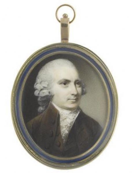 | A Gentleman, wearing brown coat, matching waistcoat, white chemise, frilled cravat and stock, his powdered wig worn en queue. | |