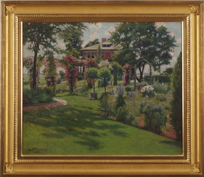 SUMMER COTTAGE WITH TRELLIS AND GARDENS IN BLOOM.