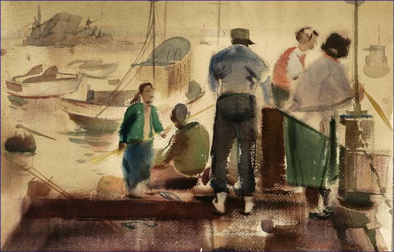 figures fishing on a pier