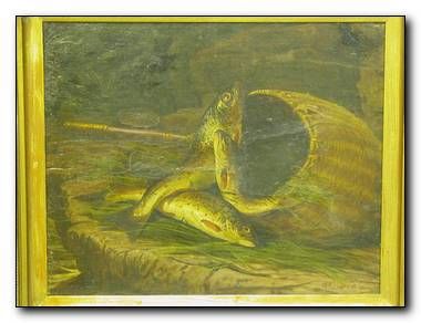 still life study of trout with fisherman's creel and rod