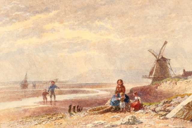 Figures on beach with a windmill beyond