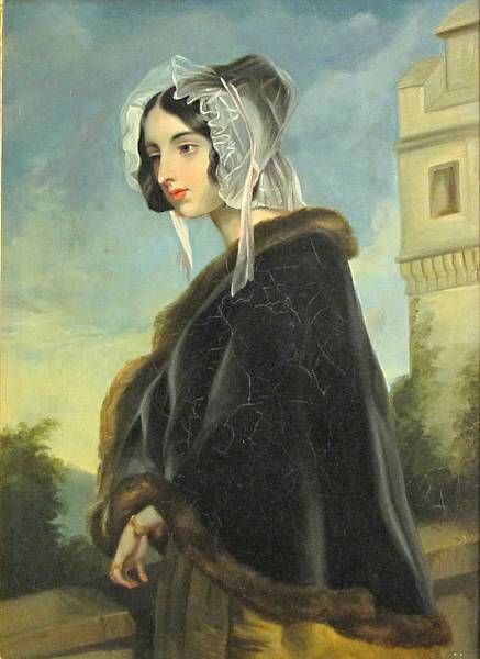 | A portrait of a woman wearing a fur-trimmed cloak standing by a balustrade | |