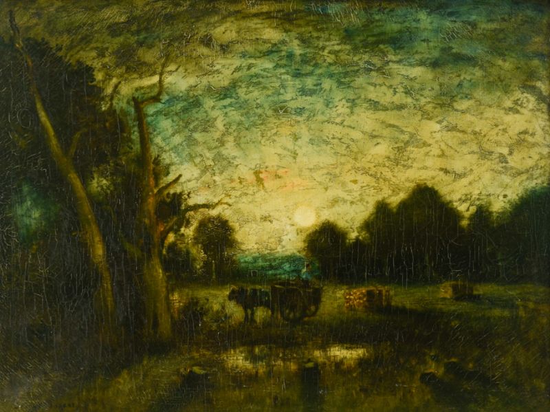| Tonalist nocturnal landscape, a man clearing land and loading wood onto a cart. | |