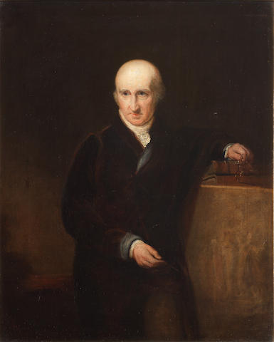 Portrait of Benjamin West P.R.A (1738-1820), half-length, in a black coat, his left hand resting on some books, a pair of spectacles in his right hand | |