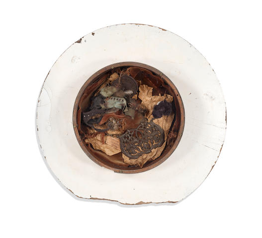 Wood paper, metal, glass, velvet, wire, string, fabric, and shoe assemblage on board