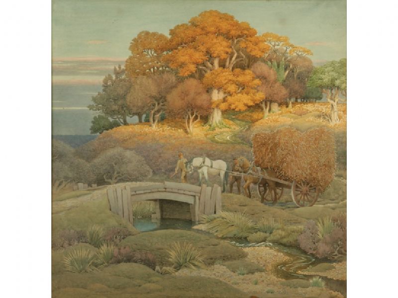 | Splash bridge below Holly Hatch in the north western corner of the New Forest with a bracken cart and two figures in the foregro | |