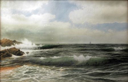 WAVES CRASHING ONTO ROCKS WITH YACHTS ON THE HORIZON