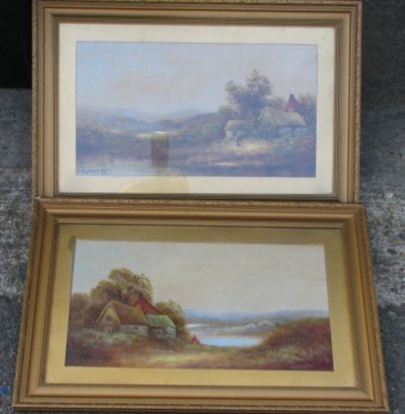 depicting figures outside cottages on river banks