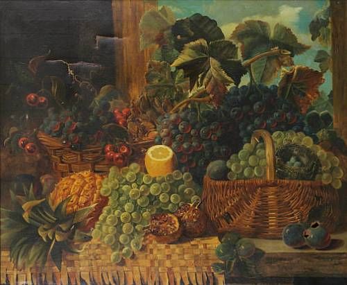 | A still life study, bunches of grapes, cherries, a pineapple, other fruit, wicker baskets and a birds nest on a shelf | |