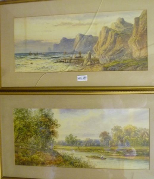 | A pair of scenes, one a cove with fishing and sailing figures, and a river scene with sheep and cattle, trees in summer leaf | |