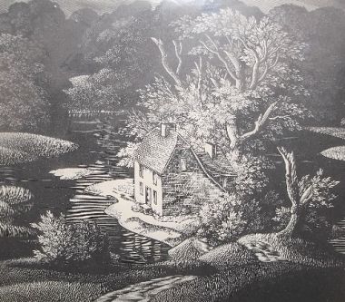 A cottage in a stylised landscape