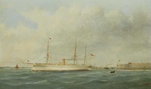| Her Majesty's Indian Marine troopship Serapis emerging from Portsmouth harbour, her decks crowded with redcoats | |