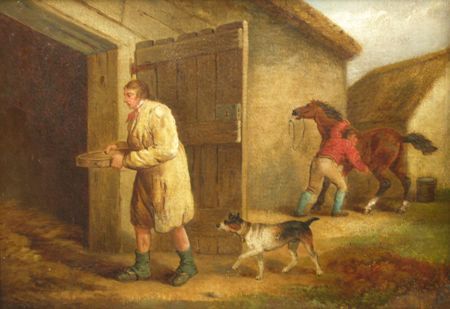 | A BAY HUNTER AND GROOM OUTSIDE A STABLE, A FIGURE AND DOG IN THE FOREGROUND | |