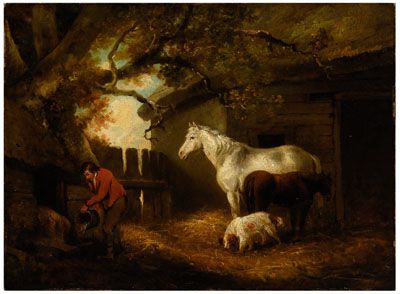 | Farmer watering pigs in a barnyard with horses and dog | |