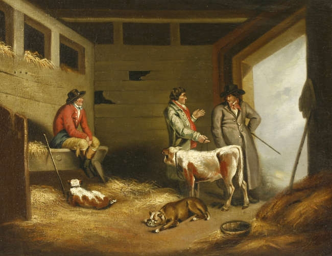 FIGURES IN A BARN WITH CALVES AND A DOG