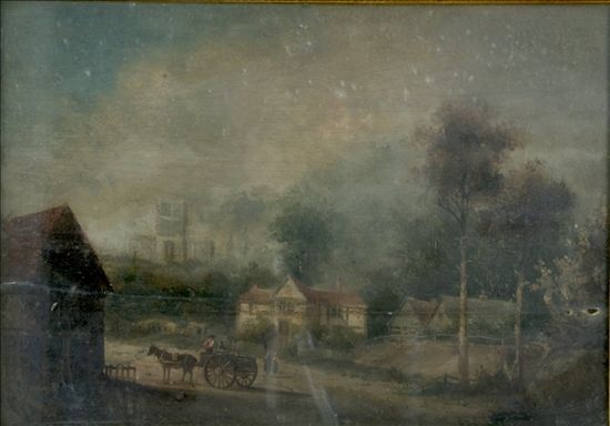 Landscape with horse cart, houses and abbey