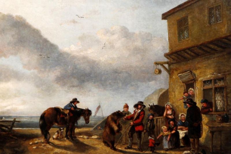 Travelling performer with a bear and a monkey outside a coastal tavern