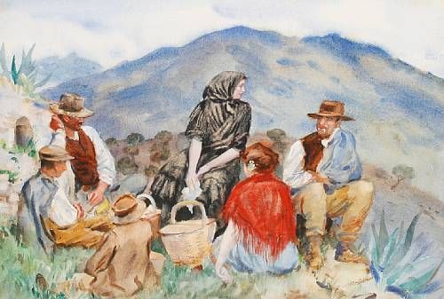 Figures picnicking on a hillside