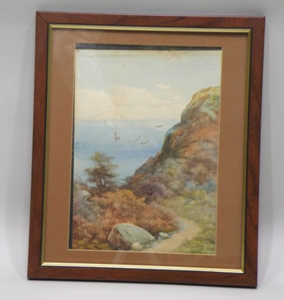 Gulls and fishing vessels off a cliff face with windy path in foreground
