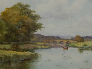 | River landscape in summer with a sailing boat and bridge in the distance | |