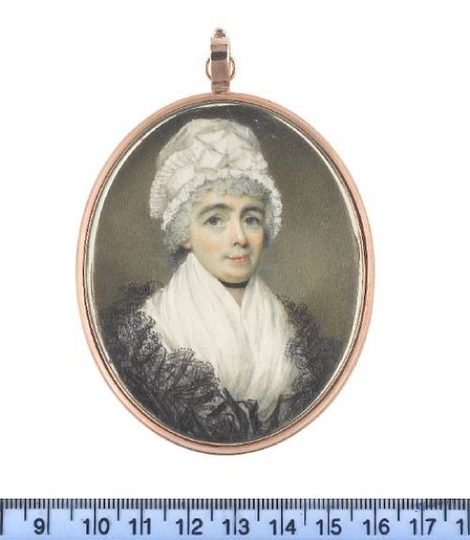 | A Lady, wearing white fichu, black lace shawl, ribbon choker and white bonnet trimmed with pleated lace border tied with wide ri | |