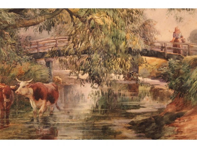 | River scene with cattle watering beneath a willow tree and a figure on a bridge | |