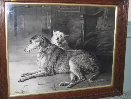 | a lurcher and a terrior resting in an interior beside a chair | |