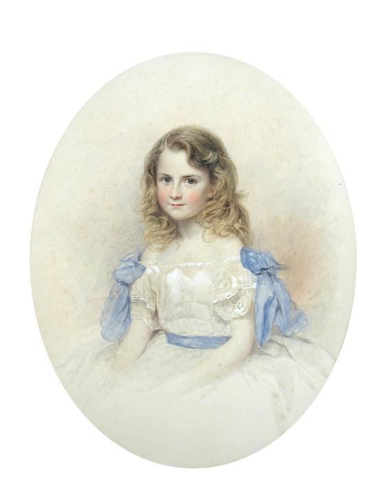 | Portrait of a young girl in a white lace dress with blue sash and blue-ribboned shoulders | |