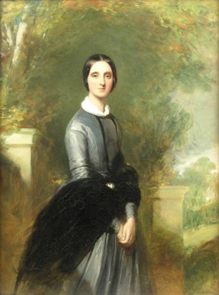 PORTRAIT OF A YOUNG LADY, THREE-QUARTER LENGTH, IN A GREY DRESS AND BLACK SHAWL IN WOODED PARKLAND
