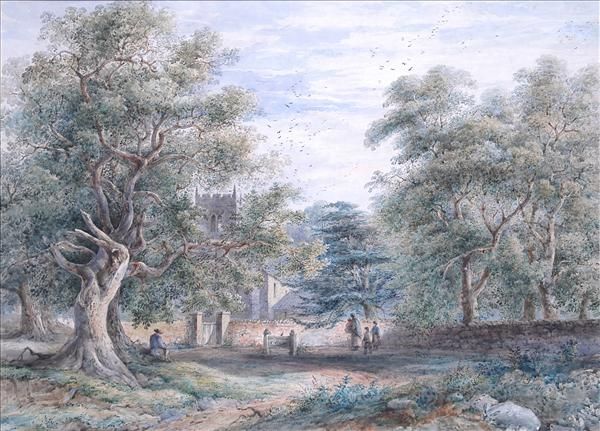 The Village Stocks, a wooded summer landscape with figures and church beyond