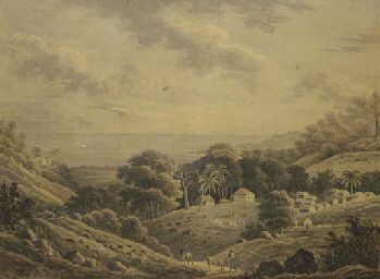 | A hillside village in the West Indies, a fort on the hilltop beyond | |