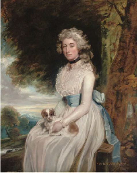 | Portrait of a lady, traditionally identified as Miss Leyborne Popham, three-quarter-length, in a white dress with a blue sash, a | |