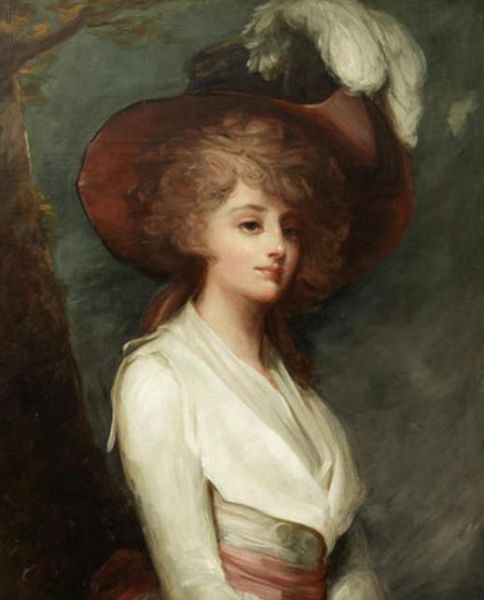 | Portrait of a young lady, three-quarter-length, in a white dress with a pink sash and a feathered hat, standing before a tree in | |