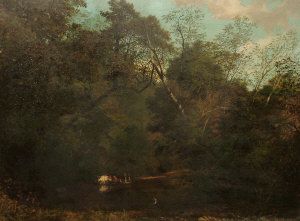 Cattle watering in a woodland pond