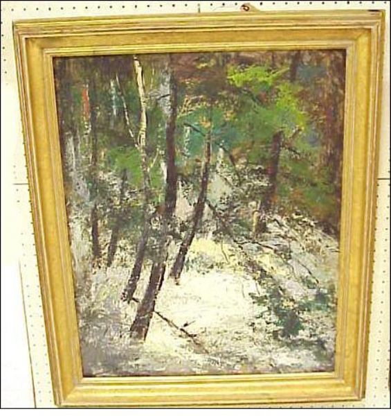| semi-abstract wooded landscape winter scene painted with palette-knife and heavy brush strokes | |