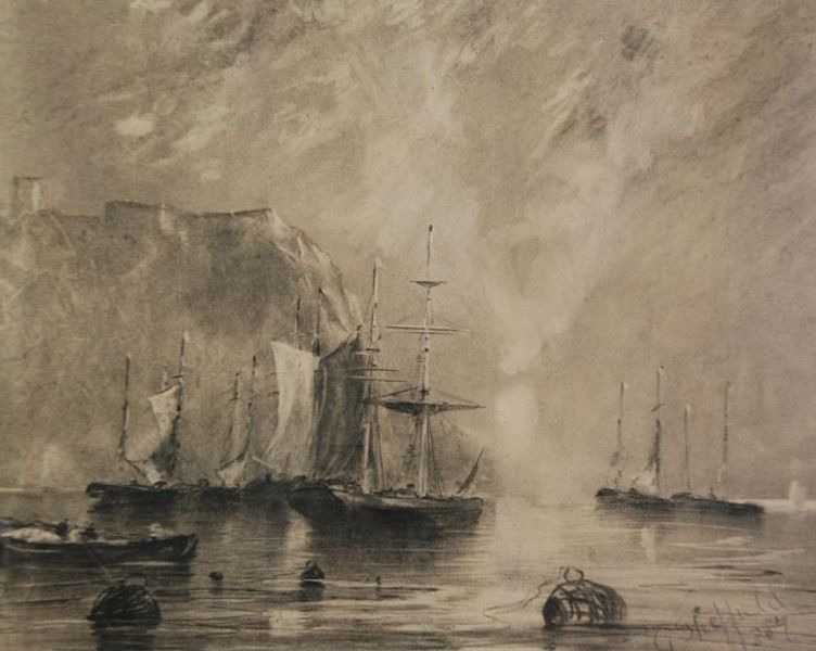 | Coastal scene with high cliffs and sailing vessels moored | |