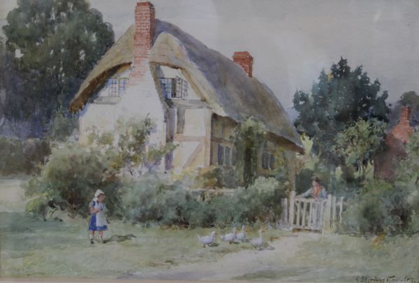 Figures by a gate and geese in front of a thatched cottage