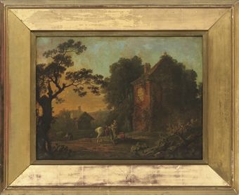 A rural village with figures by a cottage at sunset