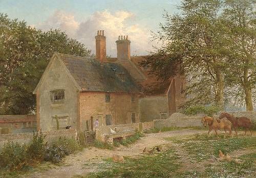 Farmyard scene with workhorses and chickens