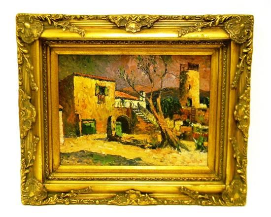 | Continental scene depicting courtyard of Spanish villa at dusk, with plaster walls | |