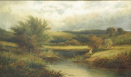 A tranquil river landscape with a figure on the bank
