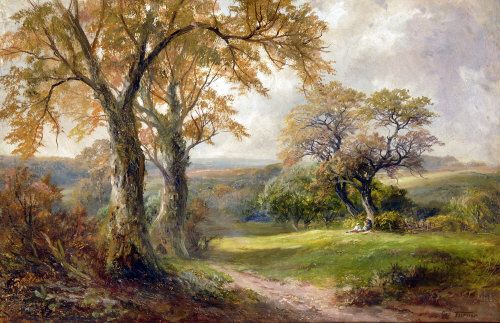 Derbyshire Woodland, with figures resting beneath a tree