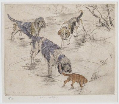 | Otterhounds, English foxhound and terrier on a river; English foxhound and terriers at a rabbit hole | |