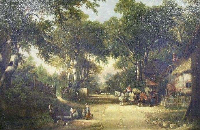 FIGURES BY A THATCHED COTTAGE