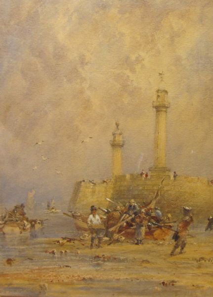 Whitby Lighthouses with Figures unloading a Fishing Boat