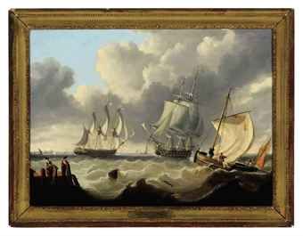 | A 74 Gun Man-of-War approaching Harbour with a Frigate Leaving | |