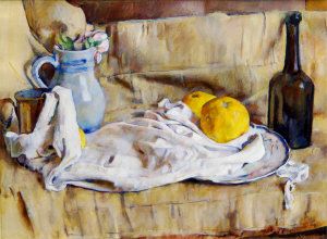 | Pink roses in a jug with lemons and a wine bottle, on a table and Apples, a wine bottle and lemon, on a table | |