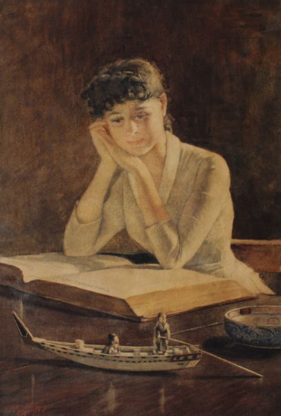 Young Girl at Desk with Oriental Sculpture and Porcelain Bowl