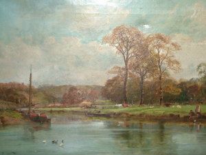 River landscape with a moored barge figures and cattle