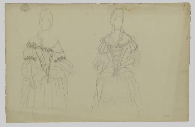 Projet de costume - Deux robes et, au dos, d'un costume d'homme dans le goût du XVIIIème